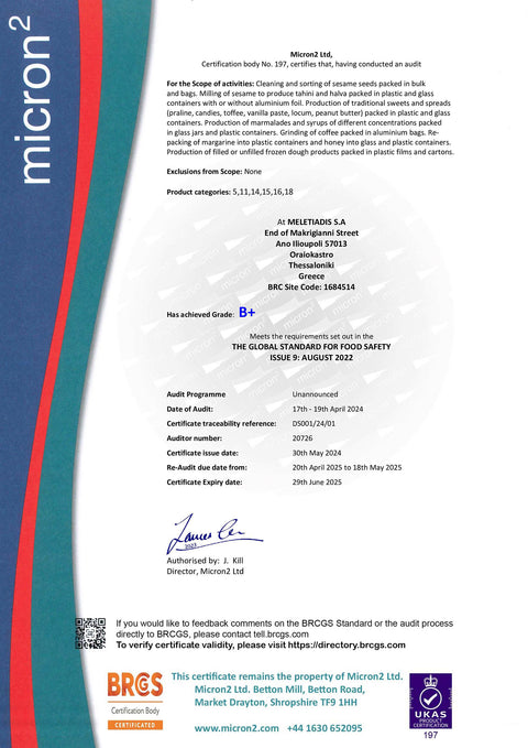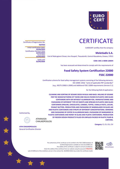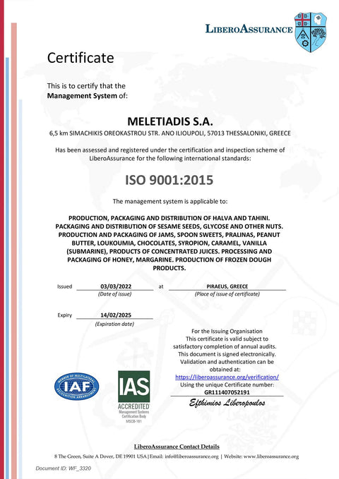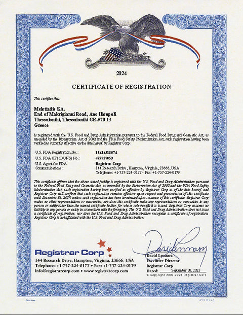 "MELETIADIS S.A.", комбинацията от отличното съвременно оборудване, с което разполага, със специализираните и добре обучени човешки ресурси, е гаранция за високото качество на нейните продукти. Дългогодишният опит и усилията за усъвършенстване, я класифицират като една от най-важните компании в бранша.
